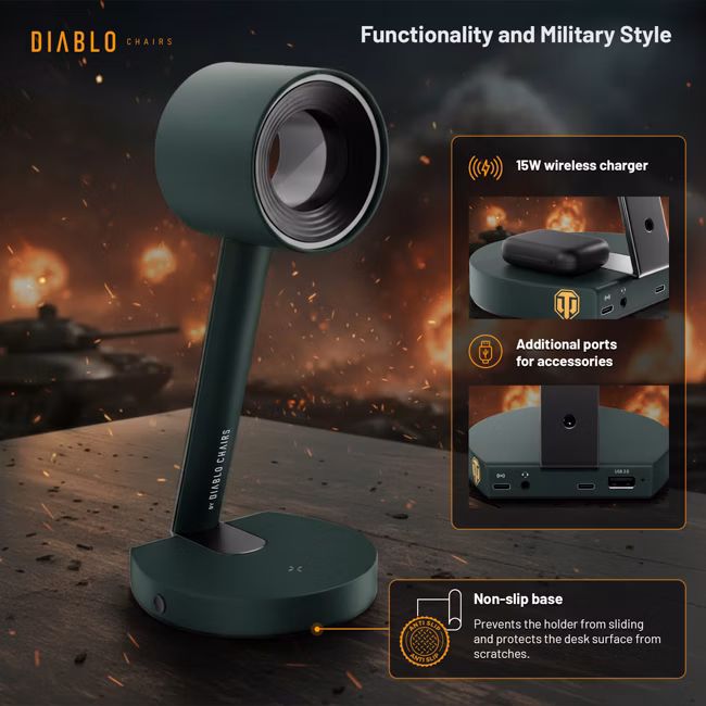 Combien de fois avez-vous cherché vos écouteurs dans toute la pièce ? Combien de fois avez-vous perdu du temps et vos nerfs à chercher votre chargeur alors que votre téléphone rendait son dernier souffle ? Combien de fois le fouillis de câbles sur votre bureau de gaming vous a-t-il fait monter la tension ? Nous connaissons bien ce problème ! C'est pourquoi le support multifonctionnel pour casque, fruit de la collaboration entre Diablo Chairs et World of Tanks, vient à votre secours. Alliant fonctionnalité et design militaire, le support pour casque WoT est un gadget indispensable, et pas seulement pour les gamers passionnés. Créez votre poste de jeu ou votre bureau à domicile idéal : ordonné, impressionnant et à votre image.