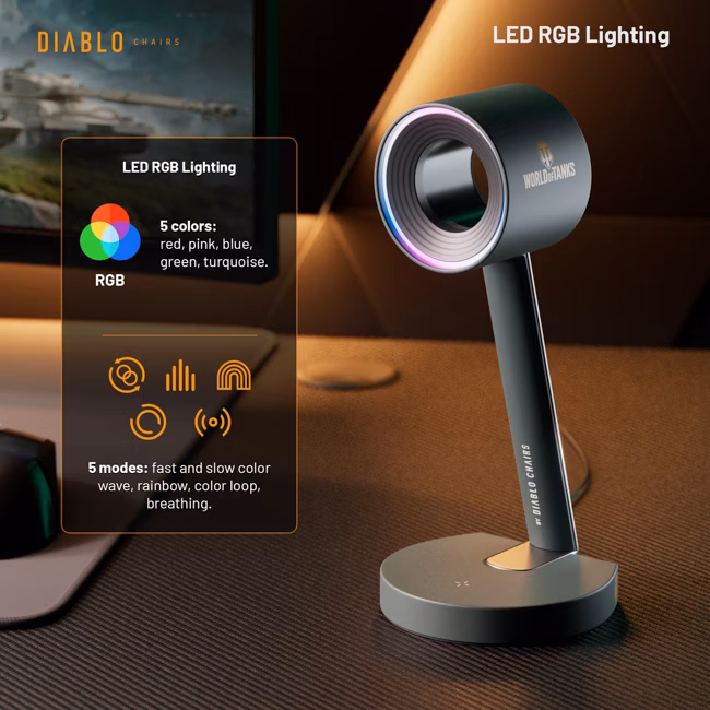 Rendezze el játékállomását az egyedülálló World of Tanks RGB fejhallgató-tartóval. Ez egy stabil tartó, vezeték nélküli töltővel és LED háttérvilágítással, amely ötvözi a katonai stílust és a praktikus funkciókat minden játékos számára.