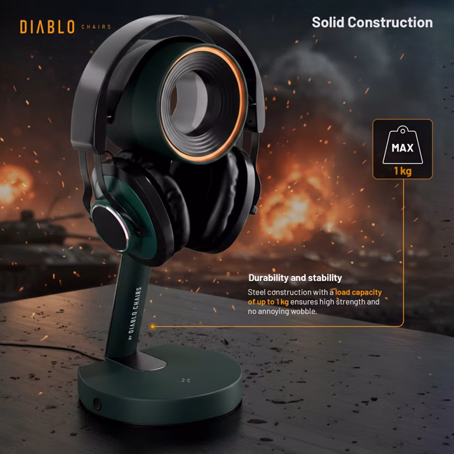 Quante volte hai cercato le cuffie in tutta la stanza? Quante volte hai perso tempo e nervi per trovare il caricabatterie quando il telefono stava per scaricarsi? Quante volte il groviglio di cavi sulla scrivania da gaming ti ha fatto salire la pressione? Conosciamo bene questo problema! Ecco perché ti viene in aiuto il supporto multifunzionale per cuffie, frutto della collaborazione tra Diablo Chairs e World of Tanks. La combinazione di funzionalità e design militare rende il supporto per cuffie WoT un gadget indispensabile non solo per i giocatori accaniti. Crea la tua postazione di gioco o home office ideale: ordinata, accattivante e in linea con il tuo stile.